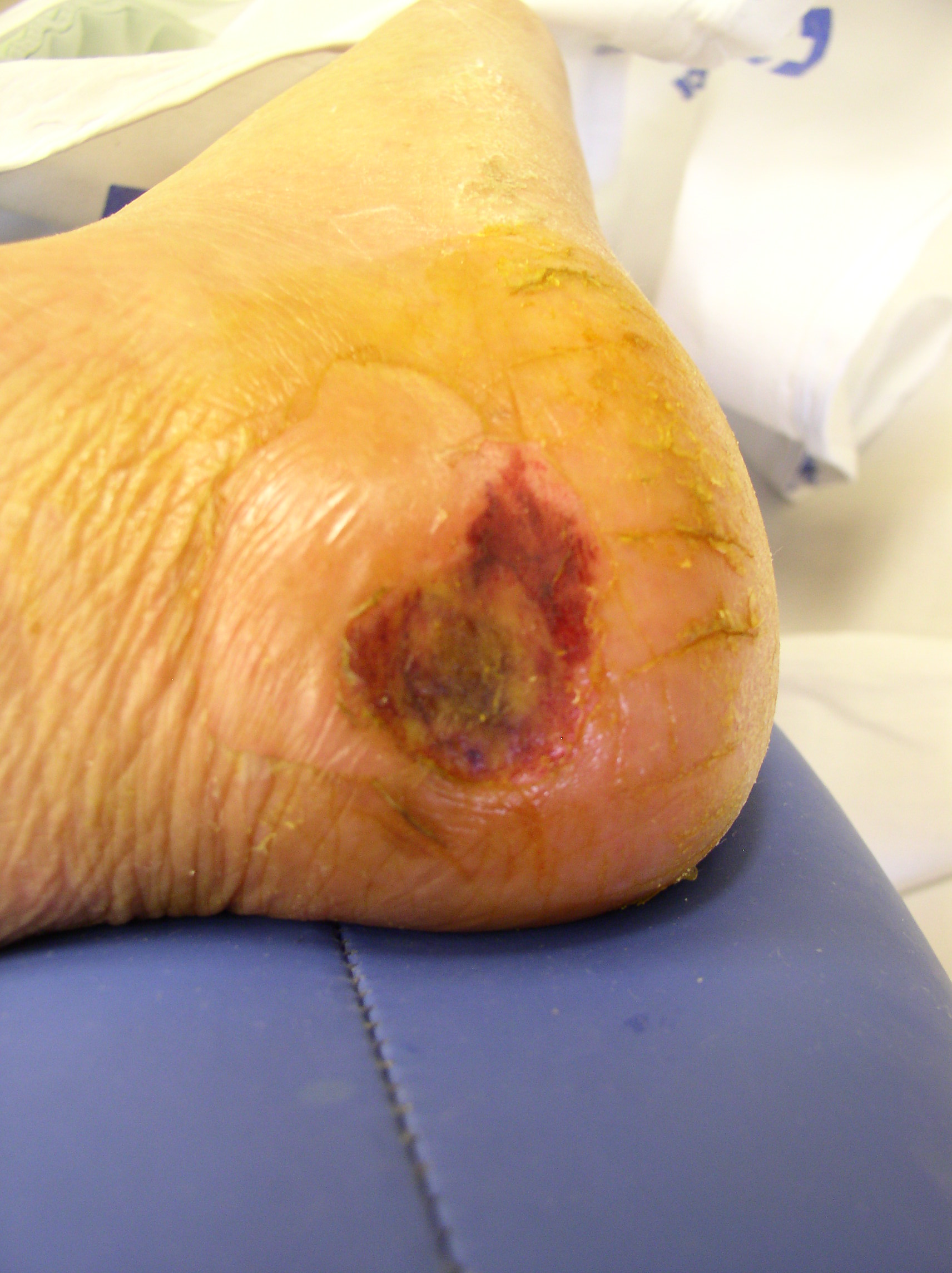 Při přijetí byl pacient napojen na UPV, dostával analgosedaci, byl intubován ústy a byl podvolen řízené ventilaci. Při přesunu na lůžko a odsávání z dýchacích cest se u pacienta objevuje flexe horních končetin a skusování endotracheální kanyly (ETK). Šíje oponuje. Permanentní močový katetr derivuje čirou moč. Na zevní straně pravé paty je povleklý defekt 2 x 3 cm s částečně nekrotickou spodinou. TK 180/95, P 74/min, TT 36,5 °C.