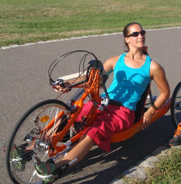 Volné chvíle tráví M. Bártová jízdou na speciálním kole.