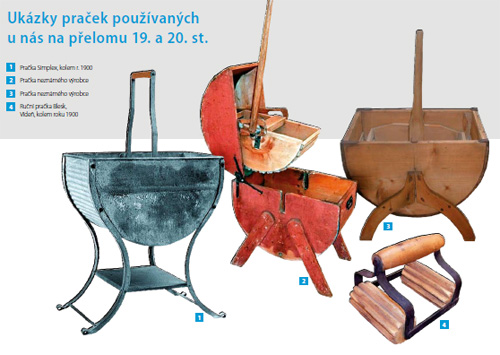 Původní pračky vypadaly jako půlválec na nohách, dno bylo vyloženo roštem z dřevěných lišt, proti němu se kývalo půlválcovou valchou. Při tomto způsobu praní se prádlo třelo, tím se ale značně mechanicky namáhalo a ničilo. Proto se vynalezly postupy, při nichž prádlo ve vodě vířilo, a protože byla dostupnější kvalitní mýdla, prádlo bylo vypráno kvalitněji. Používaly se také různé lopatky, kolíky, poháněné klikou, pákou, nejdříve byly dřevěné s kovovými panty, úchyty, převody.