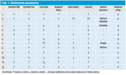 Sledované parametry: hmotnost, BMI; soběstačnost testovaná Barthelovým testem; chuť k jídlu; kognitivní funkce; kožní defekty; laboratorní výsledky. Další nutriční intervence: PEG, nazogastrická sonda; současná parenterální výživa.