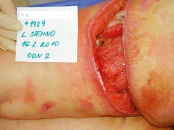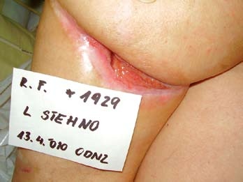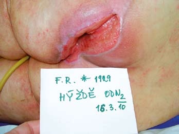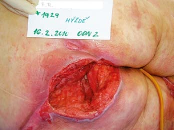 Hmotnost: 65,5 kg; imobilní; Barthelův test: skóre 20 bodů, nutriční skóre: 1. Pacientka hraničně hydratovaná, s malou chutí k jídlu, má bolesti dle 5stupňové VAS škály 3–4, psychicky alterovaná, má stavy úzkosti a občasné amentní stavy. Pro inkontinenci a lokalizaci defektů zaveden permanentní katetr. Lokální nález: pásovité dekubity do šíře 6 cm na obou hýždích až do gluteální rýhy, přes anální otvor na vnitřní stranu stehen do oblasti zevního genitálu, stupeň 3, postupně 4.