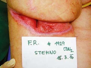 Osobní anamnéza: neprodělala žádná vážná onemocnění, do úrazu nebyla hospitalizována. Sociální anamnéza: důchodkyně, vdova, bezdětná, žije sama. Medikace: doma léky neužívala, při přijetí: Clexane, analgetika, Neurol. Nynější onemocnění: pacientka upadla na sněhu a došlo k fraktuře stydké kosti vlevo, hospitalizaci na chirurgii odmítla. Týden byla doma za pomoci sestry, celkově nesoběstačná. Kuriózně došlo ke vzniku dekubitů při dlouhodobém sezení na WC, kdy se vytvořily pásovité dekubity kopírující otisk prkénka. Poté byla přijata na oddělení dlouhodobě nemocných.