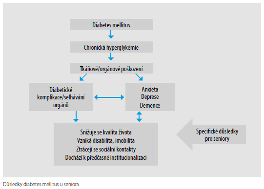 Diabetes mellitus (DM) je chronické metabolické onemocnění, jehož prevalence i incidence stoupá s narůstajícím věkem. V roce 2010 se v ČR s tímto onemocněním léčilo 806 230 osob (oproti roku 2009 nárůst o téměř 3 %). V přepočtu na tisíc obyvatel ČR to v roce 2010 představovalo 77 diabetiků (tj. o 2 diabetiky na tisíc obyvatel více než v roce předchozím). DM 2. typu je nejrozšířenější, projevuje se hlavně u lidí středního věku a starších (zdroj dat: statistika ÚZIS pro obor diabetologie). Stejně jako prognózy stárnutí populace existují prognózy o zvýšení počtu diabetiků nejen v ČR, ale i ve světě. Rostoucí počet diabetiků 2. typu lze připsat na vrub nezdravému životnímu stylu, špatným stravovacím návykům a nedostatku pohybu. Důsledky této metabolické poruchy ve vyšším věku jsou komplexnějšího charakteru a závažným způsobem zasahují do soběstačnosti, mobility, aptibility a kognitivní suficience seniora.