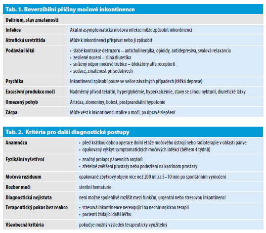 Pouze u malé části nemocných je třeba provádět před zahájením léčby nákladná speciální vyšetření (tab. 2). Mezi ně patří: dotazníkové údaje, funkční sonografie transperineální, RTG vyšetření, instrumentální vyšetření, test vážení vložek, urodynamické vyšetření.