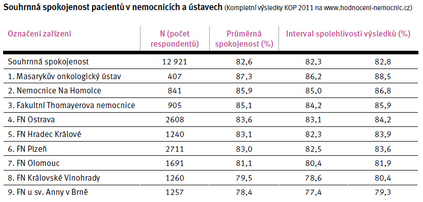 Projekt KOP v roce 2011 probíhal bez podpory a financování Ministerstva zdravotnictví. Přesto se ho „dobrovolně“ zúčastnilo šedesát procent ministerstvem přímo řízených zdravotnických zařízení. Celkem byly v kategorii nemocnic projektu KOP podle standardizované metodiky založené na statisticky validním měření spokojenosti pacientů vyhodnoceny výpovědi cca 14 000 pacientů hospitalizovaných v říjnu 2011. Vybraný vzorek reprezentuje všech 18 tisíc v tomto období hospitalizovaných pacientů, průměrná návratnost dotazníků překročila 70 procent. Sběr dat proběhl v souladu s metodickým standardem zveřejněným ve věstníku MZ ČR, všechna měřená zdravotnická zařízení tentokrát splnila minimální metodické požadavky na kvalitu dat.