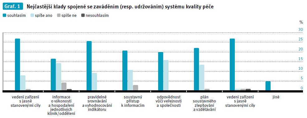 Dotazované nemocnice určily také kladné stránky zavádění a udržování řízení kvality péče. Mezi ně patří vedení zařízení s jasně stanovenými cíli (90 %) a pravidelné srovnávání a vyhodnocování indikátorů (74,29 %). Na třetí místo se zařadil plán soustavného zlepšování a vzdělávání (61,11 %), na čtvrté soustavný přístup k informacím (60 %), dále odpovědnost vůči veřejnosti a společnosti (55,56 %). Mezi zápory při zavádění kvality bývají zařazovány oblasti jako ekonomický tlak (39,39 %), nedostatečná motivace (29,41 %) a jiné, blíže neurčené, oblasti (50 %). Mezi změny, kterých by oslovená zařízení ráda dosáhla, patří zvýšená pozornost o potřeby pacientů (73,53 %), větší angažovanost lékařů (66,67 %) a zvýšení počtu pracovníků s vlastní vizí (44,12 %). Mezi ostatní oblasti, v nichž došlo ke změně, patří zavedení týmového způsobu spolupráce v instituci a přání většího podílu na dodržování doporučených postupů a standardů. Zdravotnická zařízení již alespoň z části dosáhla zavedení týmového systému spolupráce v celé instituci (48,49 %), vedoucí pracovníci v nemocnici mívají jasnou vizi (48,39 %) a povedlo se dosáhnout dodržování doporučených postupů a standardů (50 %). Od zavedení systému managementu kvality nemocnice očekávají zvýšení spokojenosti pacientů (88,24 %), zvýšení spokojenosti u zaměstnanců (52,94 %) a dodržování doporučených standardů a postupů (78,19 %). Mezi pozitivní oblasti zavádění systému kvality péče patří také předpoklad zlepšení pracovního prostředí, snížení fluktuace zdravotnických pracovníků a zlepšení ekonomické situace (tzn. snížení nákladů).