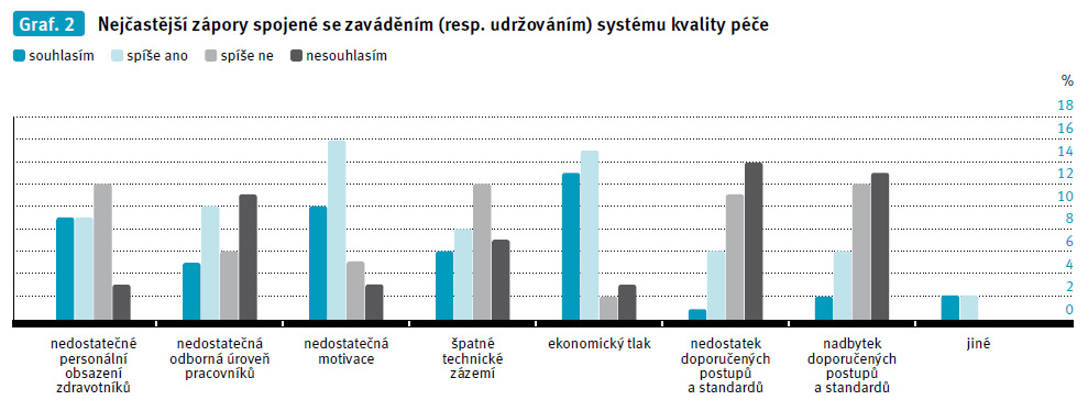 Respondenti za nejčastější nedostatky v zavádění systému řízení kvality péče považují navyklé „vertikální“ hierarchie a „ztuhlé“ struktury (72,22 %). Mezi další nedostatky lze zařadit nedostatečnou koordinaci jednotlivých organizačních celků, chyby v ekonomické oblasti či obavy z případné ztráty rozhodovacích schopností, prestiže, případně jiné, blíže neurčené oblasti.