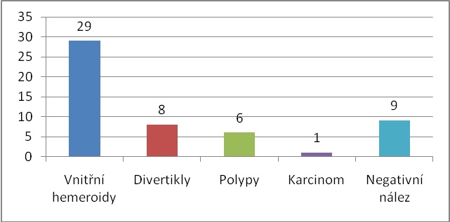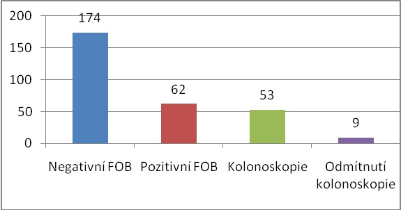 Celkově byl pozitivní nález u 62 vyšetřovaných, z toho 44 nálezů bylo ověřeno při kolonoskopii; 9 nálezů bylo při kolonoskopickém vyšetření negativních a 9 pacientů toto vyšetření odmítlo (tab. 1, graf 2 a 3).