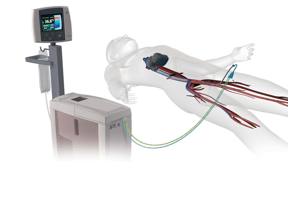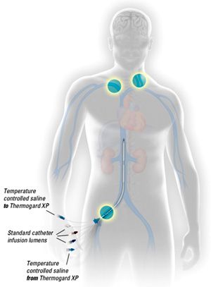 Přístroj Coolgard – tato endovaskulární metoda využívající speciální katetr, který je zaveden do dolní duté žíly cestou vény femoralis, je velmi efektivní. V uzavřeném okruhu proudí chladný fyziologický roztok, jehož teplota a rychlost cirkulace jsou řízeny extrakorporální jednotkou, která vyhodnocuje informace na základě teploty tělesného jádra. Tato teplota je měřena z teplotního čidla napojeného na speciální permanentní močový katetr (PMK). Způsob zavedení je totožný se zaváděním centrálního žilního katetru (CŽK), nezbytností je použití sterilního stolku a aseptický přístup jak ze strany lékaře, tak i ze strany všeobecné sestry. Tento speciální katetr je trojcestným CŽK, který má ovšem další vstup a výstup pro uzavřený okruh cirkulace chladicího média (fyziologický roztok 1/1; FR). Tento FR protéká v balóncích podél katetru, a tak dochází k tepelné výměně mezi chladným roztokem a krví.