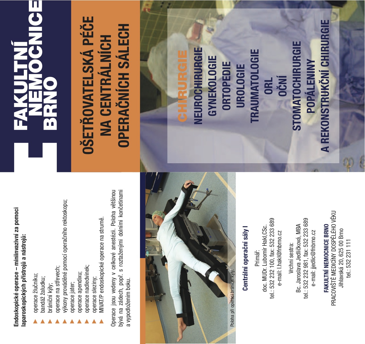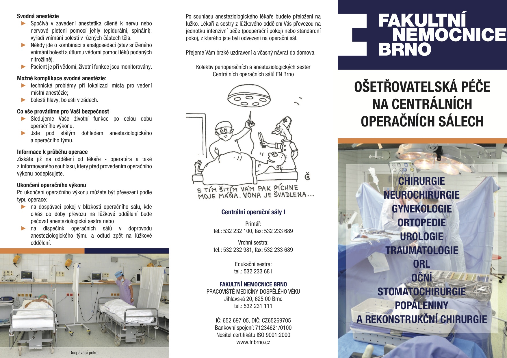 Na základě tohoto zjištění jsme přistoupily k přípravě především tištěných materiálů, které by pacient získal v předoperační době v ambulantním provozu (letáky), a dále na oddělení při hospitalizaci (informační knihy). Byly vypracovány dva druhy letáků. První obsahuje všeobecné informace o překladu pacienta na dispečinku operačního oddělení, o anesteziologické přípravě na oddělení i na předsálí a dále o tom, co může pacient očekávat v průběhu operačního výkonu a po jeho ukončení. Druhý typ letáku je vytvořen podle chirurgického oboru tak, aby měl pacient představu o průběhu výkonu. Obsahuje informace o typech prováděných operací na dané klinice či oddělení a o tom, v jakých polohách jsou výkony prováděny. Jako druhá forma edukačních materiálů byly vytvořeny informační knihy pro jednotlivá oddělení. Ty jsou umístěny na chodbách jednotlivých oddělení a v pacientských pokojích. Oproti letákům jsou rozšířeny o další informa-ce týkající se provozu operačních sálů, personálu, možností anestezie a využití medicínské přístrojové techniky. Na webových stránkách FN Brno, COS I (Centrální operační sály I), je umístěn informativní průvodce popisující průběh přijetí a cestu pacienta po operačním traktu.