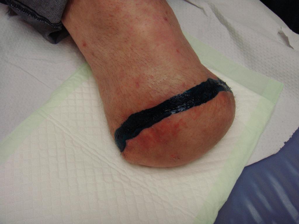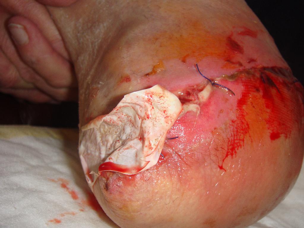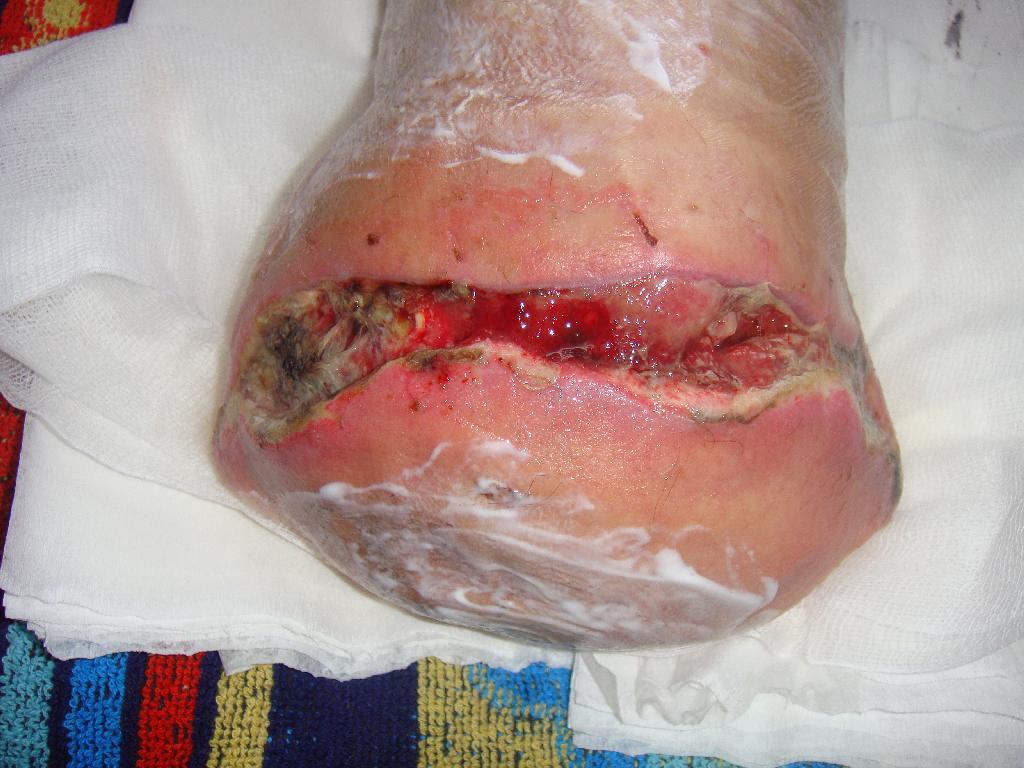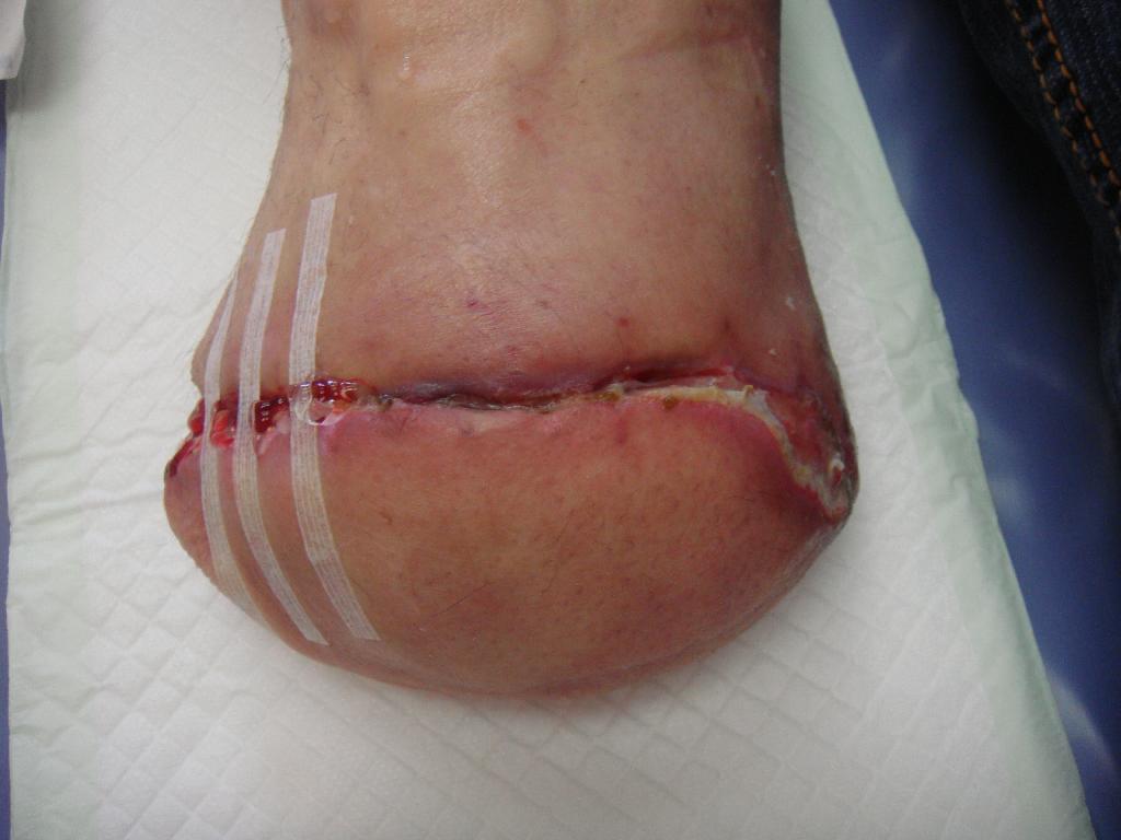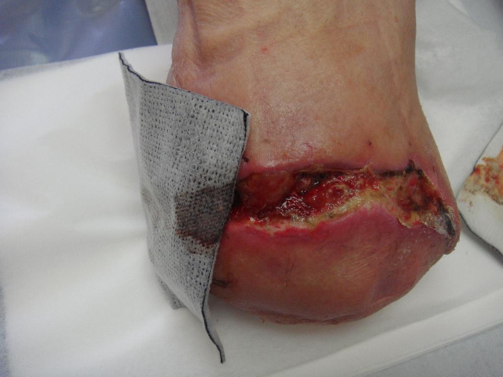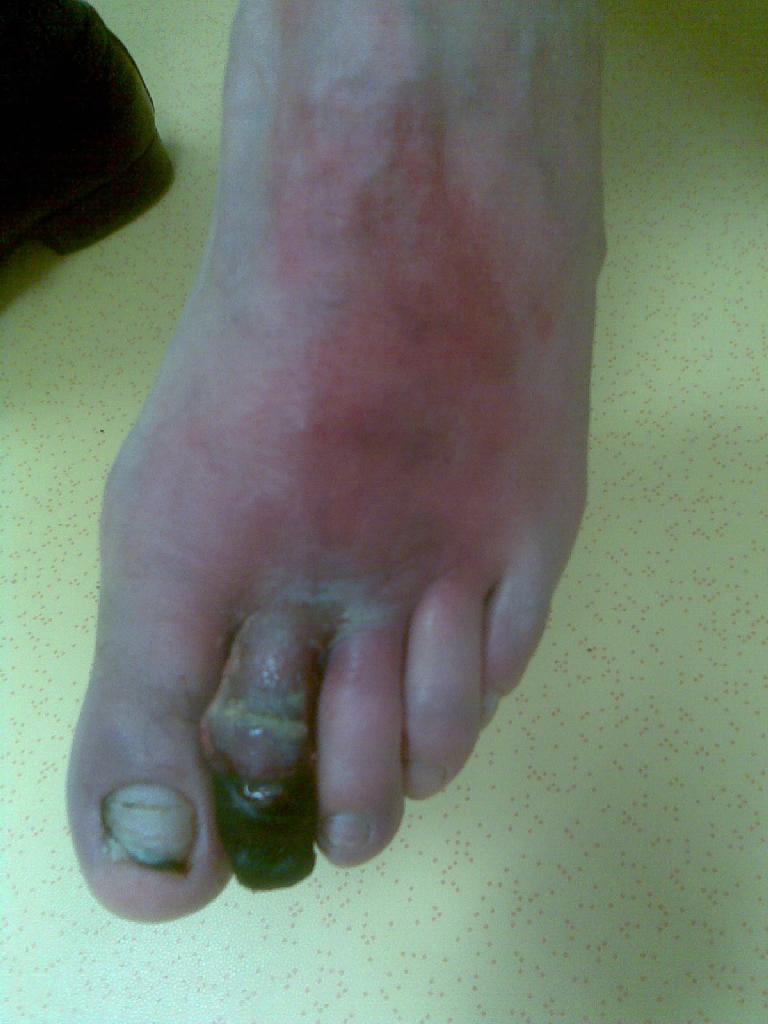 Pacient byl přijat na chirurgické oddělení pro rozvíjející se septický stav – horečku, zimnici, třesavku – to vše způsobené neléčenou nekrózou. Potíže se špatným zastřižením nehtu měl pacient opakovaně, a proto i tentokrát poranění bagatelizoval. Přišel již s nekrotickým prstem a zánětem zasahujícím vysoko nad kotník. Na oddělení byl zajištěn antibiotiky a na vazografickém pracovišti byla provedena perkutánní transluminární angioplastika (PTA) s výsledkem obnovení pulsace do periferie. Zdravotní stav pacienta se horšil a byl zjištěn absces měkkých tkání v oblasti metatarzu. Dne 5. 6. 2009 musela být provedena amputace druhého a později i třetího prstu. Rána byla ponechána otevřená, ošetřována byla roztokem Betadine a zajištěna byla sterilním krytím. Po několika dnech byl pacient propuštěn do domácího ošetřování. Koncem června se objevila flegmona dorsa a chronická sepse levé dolní končetiny. Pacient