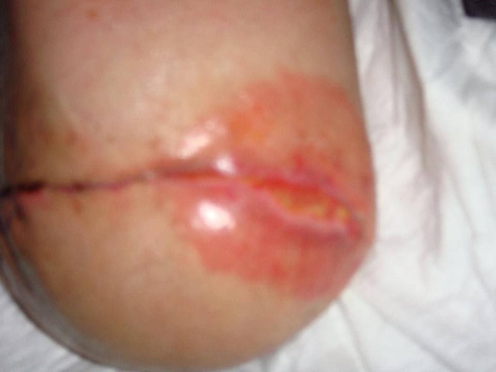 Po čtyřech dnech byla rána stále otevřená, zanícená se sekrecí, stehy musely být již dříve rozrušeny. V ráně byla objevena rezistence s hnisem. Proto jsme zvolili nový postup při ošetřování. Po oplachu a vyčištění rány sterilním roztokem Prontosanu byla jako první volba terapeutického krytí zvolena Askina Calgitrol Ag. Ta se skládá ze dvou vrstev: vrstvy absorpční polyuretanové pěny, zajišťující absorpci sekretu z rány, a vrstvy alginátu s iontovým stříbrem, působící antibakteriálně. Je-li v ráně sekret, přispívá k udržení vlhkého prostředí a podporuje přirozené hojení rány. Krytí přikládáme tak, aby na ránu přiléhalo plochou s obsahem stříbra (černý povrch). Krytí může být ponecháno na ráně až týden nebo do doby, než obvaz nasákne sekretem z rány. (obr. 3) Dne 28. 3. 2010 však byla rána i nadále otevřená, zanícená, objevily se drobné nekrózy a dehiscence. (obr. 4) Z důvodu nehojící se rány bylo zvoleno druhé terapeutické krytí. Nejprve byl proveden oplach Prontosan roztokem, který napomáhá k uvolnění a odstranění povlaku z rány. Poté proběhla exkochleace a vyplnění rány Prontosan gelem s cílem povrch rány trvale zvlhčit a zajistit dokonalé čištění a dekonta-minaci rány. Rána byla dále překryta sterilním krytím s aktivním uhlím Askina Carbosorb skládajícím se ze tří vrstev: bílé savé vrstvy vyrobené z netkaného viskózového hedvábí, polyamidu a polyesteru, dále vrstvy obsahující aktivní uhlí a zevní netkané vrstvy viskózového hedvábí a polyamidu. Askina Carbosorb absorbuje výpotek zároveň s bakteriemi a páchnoucími látkami, které se zachytí na látce s aktivním uhlím. Askina Carbosorb se přikládá tlustou bílou plochou, černá je na povrchu. U ran s velkou sekrecí se vyměňuje nejméně jednou