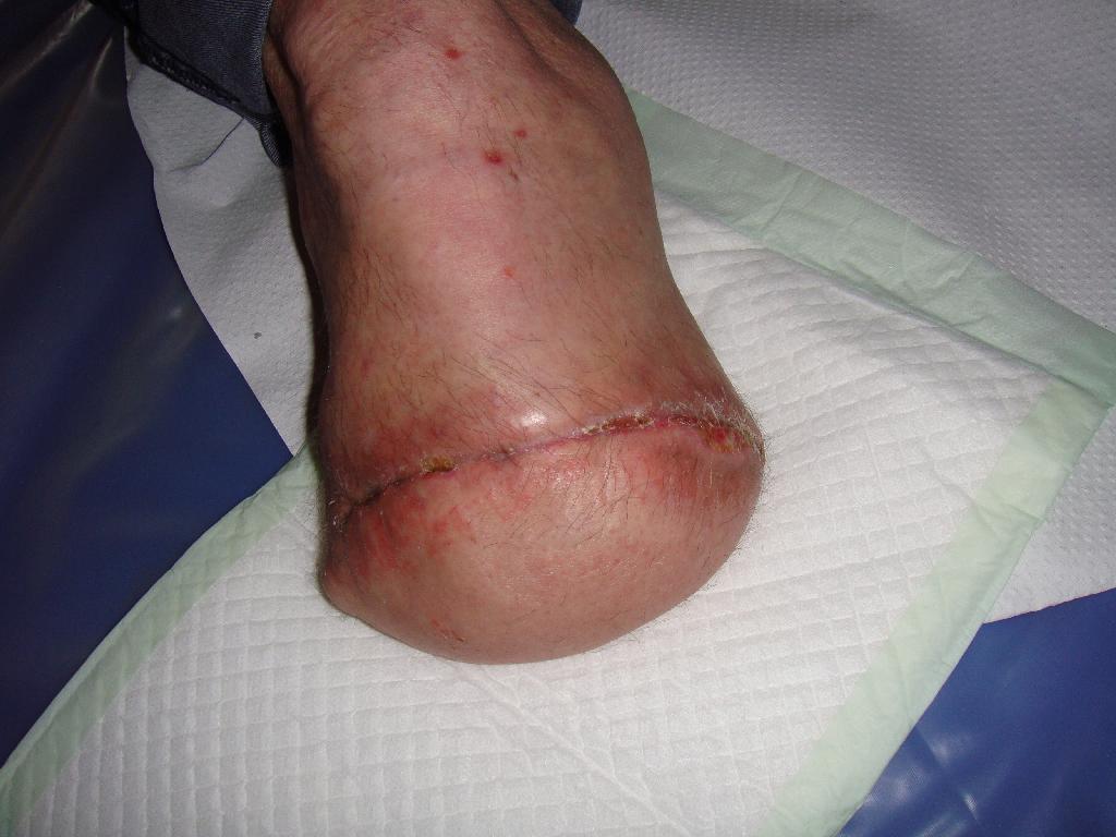 musel být znovu hospitalizován. Byla provedena nekrektomie a discize v místě flegmony. V důsledku hematemézy byla provedena gastroskopie, při níž byla zjištěna akutní nekróza jícnu. Bylo nutné zahájit podávání parenterální výživy. U pacienta byl zjištěn též minerální rozvrat. I přes četné převazy rány a léčbu antibiotiky došlo k progresi flegmony levé dolní končetiny. Vzhledem k diabetu, dlouhodobé malnutrici a prodělanému septickému stavu bylo 15. 7. 2009 nutné přistoupit k amputaci levé dolní končetiny v bérci. Byla preferována koleno šetřící operace pro lepší následnou rehabilitaci a možnost protézy. Po dvou týdnech byl pacient propuštěn do domácího ošetřování. Pahýl byl klidný.