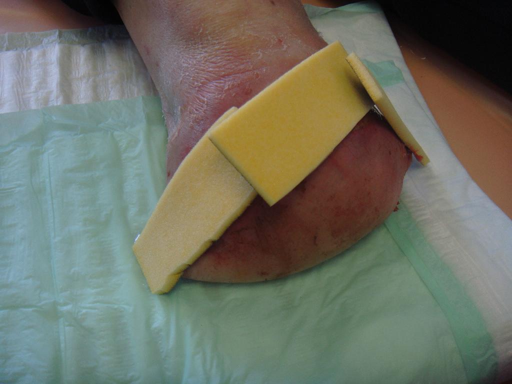 Dne 3. 8. 2009 muselo proto dojít k reamputaci a další redukční operaci skeletu bérce. Následovala rehabilitace, pravidelné převazy rány a koncem roku byl pacient schopen chůze s protézou o francouzských holích. Na počátku roku 2010 přišel pacient do nemocnice znovu s rozvíjející se nekrózou třetího prstu pravé dolní končetiny a flegmonou okolních tkání. Přestože tentokrát nic neponechal náhodě a již u prvních příznaků vyhledal lékaře, došlo k rychlé progresi zánětu a rozvoji septického stavu. Dne 2. 3. 2010 musela být z vitální indikace provedena amputace bérce pravé dolní končetiny pod kolenem. Následovala rehabilitace na lůžku a později přeložení na rehabilitační kliniku. Pacient po dvou dnech udával bolest pahýlu a rána objektivně prosakovala. Bylo nutné přerušit rehabilitaci a následovaly každodenní převazy. Dne 20. 3. 2010 byla v oblasti sutury provedena nekrektomie, rána byla propláchnuta roztokem Betadine a byl zaveden rukavicový drén. Rána byla ošetřena Višněvského balzámem a sterilním krytím. (obr. 2) Na přání pacienta (mého blízkého rodinného příslušníka) a po domluvě s jeho ošetřujícím lékařem mi bylo umožněno účastnit se každodenních převazů na chirurgické ambulanci a samostatně provádět ošetřování rány v rámci domácí péče. Pacient byl plně odkázán na invalidní vozík a již pouhá přítomnost blízké osoby při převazech na chirurgii byla pro něho povzbuzením a psychickou oporou.