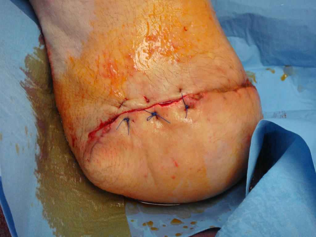 Defekt se hojil jen pomalu a okraje rány se stále nedařilo zacelit. Z obavy z možného opětovného vzniku abscesu nebyla rána sešita a bylo přistoupeno k alternativní metodě scelení rány – okraje rány byly v období 21. 4. – 5. 5. 2010 stahovány náplastí Steri-strip. (obr. 7) Použitím Steri-stripu bylo docíleno stažení rány na půlce defektu, a proto mohlo 5. 5. 2010 dojít k sešití rány. (obr. 8) Větší část rány se úspěšně zhojila a na zbývající nezhojenou část byl aplikován Hyiodine – sterilní viskózní roztok yaluronátu sodného. Má červenohnědou barvu. Obsahuje jód, který brání rychlému rozpadu hyaluronátu sodného bakteriemi přítomnými v ráně a okolí. Používá se ke krytí, čištění a hydrataci hlubokých ran a kožních defektů. (obr. 9) Vlastní ložisko rány se zmenšilo a vyčistilo, nicméně dne 16. 5. 2010 bylo nutno od aplikace Hyiodine ustoupit, protože okolí rány vykazovalo alergickou reakci na tento přípravek. (obr. 10) Na zarudlé okolí rány byla použita mast Calcium panthotenicum, rána byla kryta pouze sterilním krytím. Postupem času se rána hojila, vzhled defektu zlepšoval, od 26. 5. 2010 byla rána zacelena natolik, že mohla být kryta pouze Novikovem (Solutio Novikov). (obr. 11, 12) Výsledkem popsané léčby byly zhojené pahýly pacienta po amputaci obou dolních končetin. Díky tomu nemuselo dojít k reamputaci nad kolenem, které jsme se neustále obávali. S pomocí dvou protetických náhrad dolních končetin je pacient za pomoci francouzských holí schopen samostatného pohybu a chůze do schodů. Zachování kolenního kloubu a protetické náhrady mu umožňují i řídit auto upravené na ruční řízení.