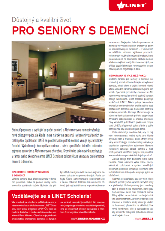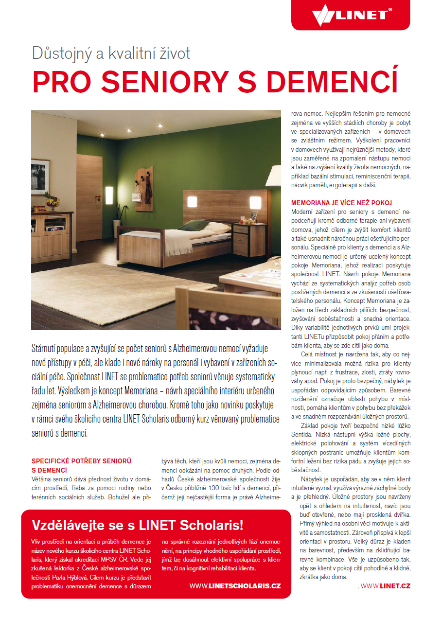 Stárnutí populace a zvyšující se počet seniorů s Alzheimerovou nemocí vyžaduje nové přístupy v péči, ale klade i nové nároky na personál i vybavení v zařízeních sociální péče. Společnost LINET se problematice potřeb seniorů věnuje systematicky řadu let. Výsledkem je koncept Memoriana – návrh speciálního interiéru určeného zejména seniorům s Alzheimerovou chorobou. Kromě toho jako novinku poskytuje v rámci svého školicího centra LINET Scholaris odborný kurz věnovaný problematice seniorů s demencí.
