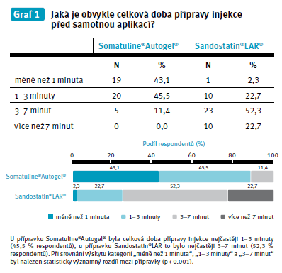 Vysoce statisticky významný rozdíl (p < 0,001) byl naopak nalezen v celkové době přípravy injekce před jejím podáním. Pro přípravky Somatuline® Autogel® byla nejčastější odpověď 1–3 minuty, pro přípravek Sandostatin® LAR 3–7 minut (viz graf 1). U tohoto přípravku hodnotily tři čtvrtiny respondentek jako časově nejnáročnější krok promíchání obsahu lahvičky až do vzniku mléčné suspenze. Pro přípravek Somatuline® Autogel® to bylo sejmutí ochranného krytu pístu stříkačky.