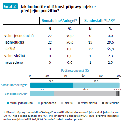 Obtížnost přípravy přípravku Somatuline ® Autogel® hodnotily všechny respondentky jako velmi snadnou nebo snadnou. U přípravku Sandostatin® LAR hodnotilo 65,9 % respondentek přípravu jako složitou. Statistické srovnání nebylo možné v tomto případě provést (viz graf 2). Jako nejobtížnější bylo u tohoto přípravku největším procentem uživatelek (66,7 % z těch, které označily přípravu jako složitou nebo velmi složitou) označeno promíchání obsahu lahvičky až do vzniku mléčné suspenze. Pro přípravek Somatuline® Autogel® nebyl žádný z kroků přípravy označen jako obtížný (viz tab. 1).