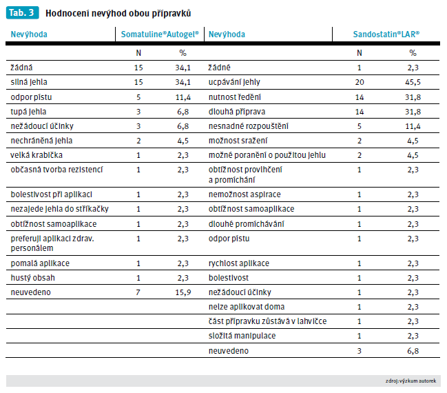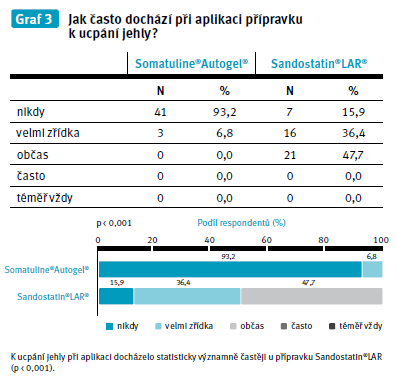 Během aplikace může také dojít k ucpání jehly. U přípravku Somatuline® Autogel® uvedla drtivá většina respondentek, že k tomuto problému nedochází nikdy, a pouze 6,7 % uvedlo, že k němu dochází velmi zřídka. Naproti tomu u přípravku Sandostatin® LAR uvedlo 47,7 % respondentek, že k tomuto problému dochází občas. Pokud dojde k ucpání jehly, je nutné ji vyměnit, aby bylo možné dokončit podání léku. Tato situace je nepříjemná pro pacienta a navíc nemůže být např. garantováno, že byla správně podána celá dávka léku. Možnost ucpání jehly uvedla i většina respondentek na prvním místě mezi nevýhodami přípravku Sandostatin® LAR.