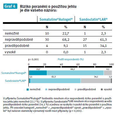 V souvislosti s likvidací použité stříkačky odpověděla většina respondentek, že riziko poranění se o použitou jehlu vnímá jako nemožné nebo nepravděpodobné pro přípravek Somatuline® Autogel ®. I u přípravku Sandostatin® LAR uvedla většina respondentek toto riziko jako nemožné nebo nepravděpodobné, avšak 34,1 % respondentek uvedlo toto riziko jako pravděpodobné. Tento rozdíl je opět vysoce statisticky významný (p < 0,001) (viz graf 4).