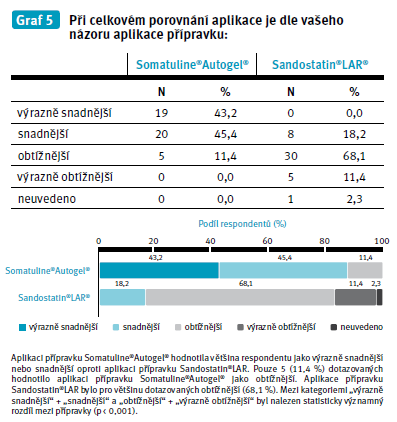V závěrečném celkovém hodnocení bylo podání přípravku Somatuline® Autogel ® hodnoceno naprostou většinou respondentek jako výrazně snadnější nebo snadnější než podání přípravku Sandostatin ® LAR. Celkem 11,4 % odpovědělo, že podání přípravku Somatuline® Autogel ® je obtížnější. Nikdo neuvedl, že aplikace je výrazně obtížnější. Podání injekce přípravku Sandostatin® LAR hodnotilo jako obtížnější 68,1 % respondentek, jako výrazně obtížnější 11,4 % respondentek. Tento rozdíl je vysoce statisticky významný (p < 0,001) (viz graf 5). Jako hlavní výhody uvedly respondentky u přípravku Somatuline® Autogel® to, že není nutné ho ředit a snadno se aplikuje. Naproti tomu většina respondentek uvedla, že přípravek Sandostatin® LAR žádnou výhodu nemá (viz tab. 2). U přípravku Somatuline® Autogel® odpovědělo nejčastěji stejné množství respondentek, že nevýhodou je silná jehla a že žádnou nevýhodu tento přípravek nemá. U přípravku Sandostatin® LAR jsou nejčastěji jako nevýhody vnímány riziko ucpání jehly a nutnost ředění (viz tab. 3).