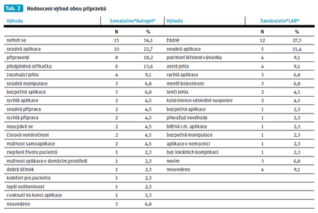 Cílem tohoto průzkumu bylo srovnat snadnost aplikace dvou depotních analog somatostatinu dostupných v České Republice (Somatuline® Autogel®; Ipsen Pharma a Sandostatin® LAR; Novartis) z pohledu sester. V celkovém hodnocení byl výrazně lépe hodnocen přípravek Somatuline ® Autogel®.