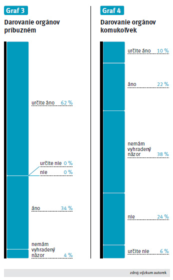Rozhodnúť sa darovať vlastný orgán pre lepší život druhého určite nie je jednoduché. V tomto rozhodovaní zohrávajú veľkú úlohu najmä citové väzby. Zisťovali sme ochotu respondentov darovať vlastné orgány nielen vo vzťahu k príbuznému. Výsledky výskumu ukazujú, že 96 % respondentov by darovalo orgány príbuznému, z toho možnosť „určite áno“ uviedlo 62 %. 4 % respondentov sa konkrétne nevedeli vyjadriť. Ochotu darovať vlastné orgány komukoľvek vyjadrilo len 32 % a 30 % by vlastné orgány určite komukoľvek nedarovalo. Zvyšných 38 % sa nevedelo konkrétne vyjadriť.
