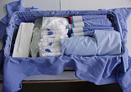 Příjem, kontrola a použití operačního prádla Počty KOP (kompletní operační prádlo) přijímá perioperační sestra podle plánovaného operačního programu. Soupravy jsou rozděleny podle typů operačních výkonů jednotlivých oborů. Tyto sety jsou složením podobné jako jednorázové soupravy. Na COS se denně expeduje průměrně 66 kontejnerů s tímto materiálem. Kontejner je pracovníky CS připraven a složen tak, aby si perioperační sestra při prvotním otevření a rozložení vnitřní roušky odebrala a překontrolovala procesový indikátor a oblékla sterilní operační plášť. Další roušky jsou v kontejneru uloženy k snadnému, bezpečnému a postupnému zarouškování operačního pole po proběhlé antisepsi. Po ukončení operačního výkonu jsou veškeré použité i nepoužité roušky a pláště uloženy do průhledných igelitových pytlů a odneseny na sběrné místo do transportních kontejnerů. Ty jsou v pravidelných intervalech odváženy z COS do nemocniční prádelny ke zpracování.
