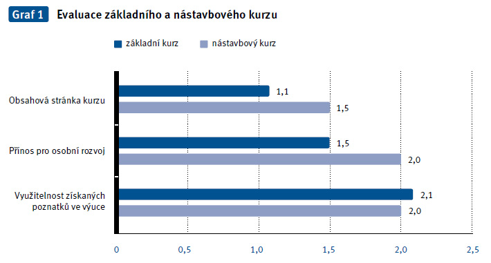 Nástavbový kurz sexuologie se konal o rok později taktéž pod vedením paní primářky, tentokrát se zaměřením na problematiku sexuality u pacientů s psychózami a depresemi, u pacientů závislých na návykových látkách, onkologicky a neurologicky nemocných, smyslově a somaticky handicapovaných, u žen v těhotenství, laktaci a v klimakteriu. Kurz byl opět doplněn četnými a velmi zajímavými kazuistikami z praxe. Kurzu se zúčastnilo 18 pracovníků. Po ukončení každého kurzu byla provedena jeho evaluace. Pro vyhodnocení kurzu byl vytvořen anonymní dotazník obsahující 6 otázek zaměřených na hodnocení kurzu. Otázky č. 1–6 byly vyhodnocovány prostřednictvím hodnotící škály (1 – velmi dobře až 5 – nevyhovující) – výsledky jsou znázorněny v průměrných hodnotách v pruhovém grafu (graf 1). Z výsledků vyplývá, že akademičtí pracovníci byli s kurzy spokojeni, kladně byl hodnocen i přístup lektorky a její reakce na dotazy. V současné době dochází k aplikaci získaných poznatků do výuky na FZS UPa, a to zejména do předmětů Ošetřovatelství, Základy ošetřovatelství a Teorie porodní asistence, kde je vyhrazen prostor pro problematiku lidských potřeb včetně potřeb sexuálních.