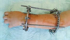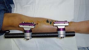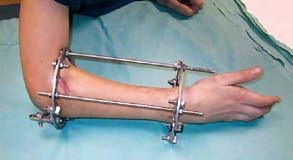 a) zevní fixátor pro zlomeniny humeru, respektive i předloktí;