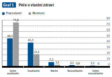 Pravoslavní berou zdraví jako dar od Boha. Jejich zdraví je v rukou Božích a za udržení svého zdraví se modlí. 88 % respondentů pečuje o své zdraví (graf 1). V zájmu svého zdraví neodmítají žádné vyšetřující nebo terapeutické výkony. Přijmou transfuzi i transplantaci.