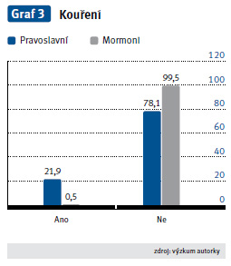 Mormoni doporučují svým členům následovat zdravý životní styl. Mormoni dodržují tzv. Slovo moudrosti (Vokoun, 2009). Toto učení zakazuje pití alkoholu, kávy, zeleného a černého čaje, užívání drog a kouření. Členové církve věří, že lidské tělo je drahocenný dar od Boha, který musí být chráněn (část 89 z knihy Slovo moudrosti). Jen 1,3 % respondentů uvedlo, že p jí alkohol příležitostně, a 98,7 % respondentů uvedlo, že alkohol nepijí (graf 2). 99,5 % respondentů nekouří (graf 3).