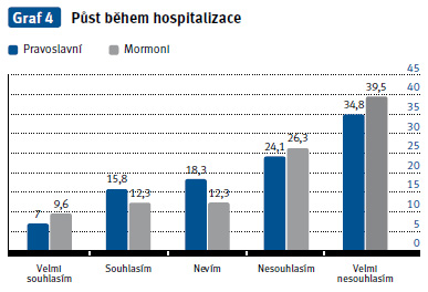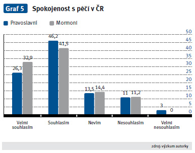 Pravoslavní mohou aplikovat svou víru i během hospitalizace. Př i hospitalizaci nemají žádná omezení v oblasti podávání léků. Většina dotazovaných uváděla, že jsou s péčí v ČR spokojeni (graf 5). Jen by si přáli větší respekt od zdravotnického personálu a umožnění přítomnosti duchovního v nemocničním zařízení. Polovina respondentů neví, zda chtějí, aby jejich náboženské potřeby byly zdravotníky respektovány (Michálková a kol., 2011).