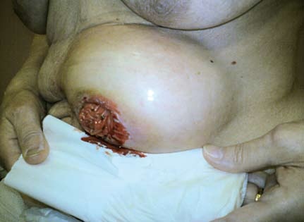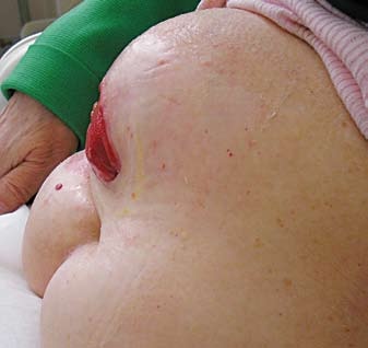 Velikost parastomální kýly ovlivňuje klinické obtíže pacienta. Parastomální hernie se může manifestovat jako drobné vyklenutí břišní stěny, kdy se nevyskytují subjektivní stesky a ani péče o stomii, včetně bezpečné fixace stomických pomůcek, není ovlivněna. U stomiků, kdy je stomie retrahována, může dokonce dojít k částečné žádoucí úpravě stavu okolí stomie, která tím pádem dosahuje niveau břišní stěny a ošetřování vývodu je tak paradoxně usnadn ěno. Stomik pak obvykle nepotřebuje konvexní pomůcky, vkládací kroužky nebo pasty pro utěsnění pomůcky kolem vývodu. Naopak setrvání u tohoto sortimentu pomůcek může způsobit tlak na kůži v okolí stomie a tím další potíže pacienta (foto 1). Na fotografii je zobrazena stomie a rozsáhlá parastomální kýla. Krvácení z kůže kolem stomie bylo způsobeno jejím tlakovým poškozením současně s dalším faktorem, kterým bylo dlouhodobé užívání antikoagulancií a chemoterapie. Cílem je v tomto případě zhojení peristomální kůže pomocí hydrokoloidního zásypu (případně dalšího příslušenství) a vhodné stomické pomůcky. Proto byl použit velkoobjemový jednodílný sáček, jehož hydrokoloidní plocha je větších rozměrů. Hydrokoloidy jsou totiž suverénně nejlepším materiálem pro hojení peristomálních defektů a velká plocha se dobře přizpůsobuje i nerovnému terénu. Po zhojení akutního stavu se můžeme se stomikem rozhodovat o dalších možnostech ošetřování vývodu vzhledem k jeho soběstačnosti a charakteru vyprazdňování.