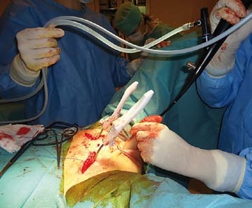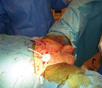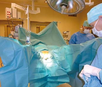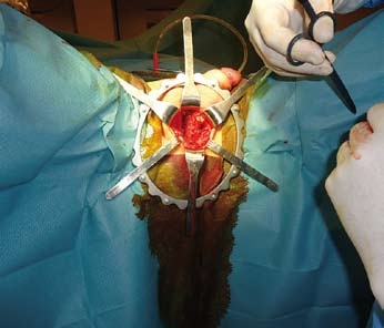 Břicho a perineum musí být důkladně oholeno. Dle doporučení instruktážního videa výrobce omývá asistence operační pole houbičkou s Braunolem po dobu deseti minut a dalších deset minut dezinfikuje pomocí tamponů. Pak následuje pečlivé zarouškování včetně konečníku.