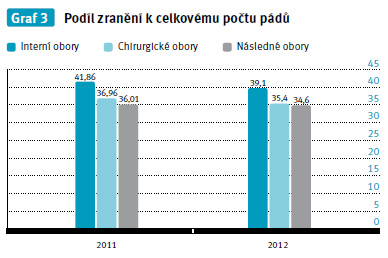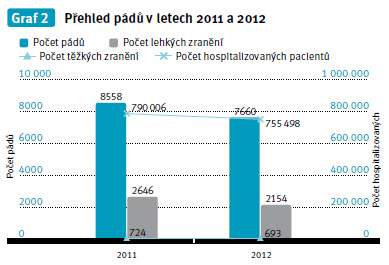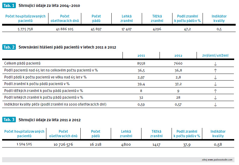 Zdravotníci během sledování indikátoru kvality Pády u hospitalizovaných pacientů v letech 2011 a 2012 zaznamenali z celkového počtu 1 545 504 hospitalizovaných pacientů 16 218 pádů (1 %); z toho pádů s lehkým zraněním 4800 (30 %), se zraněním těžkým 1417 (9 %). Podíl zranění na celkovém počtu pádů činil 39,38 % (2011), respektive 37,17 % (2012).