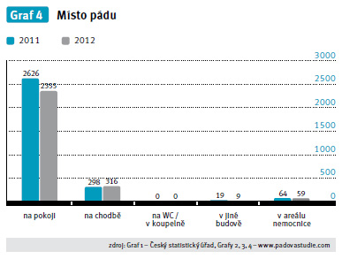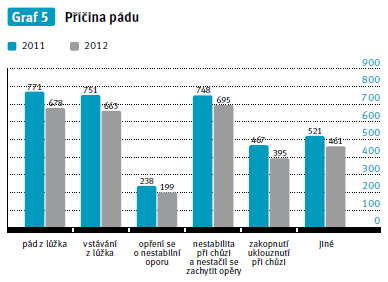 ■ Příčina pádu - zdravotníci mohli zadat „pád z lůžka", „vstávání z lůžka", „opření o nestabilní oporu", „nestabilita při chůzi a nestačil se chytit opěry", „zakopnutí, uklouznutí při chůzi". Zatímco v roce 2011 představoval nejčastější příčinu „pád z lůžka" (771 hlášení - 23 %), v roce následujícím šlo o „nestabilitu při chůzi a nestačil se chytit opěry" (695 hlášení - 23 %).