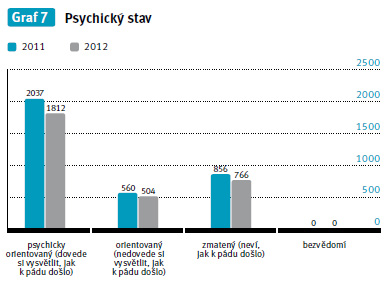 ■ Psychický stav - zdravotníci mohli zaznamenat „psychicky orientovaný (dovede si vysvětlit, jak k pádu došlo)", „orientovaný (nedovede si vysvětlit, jak k pádu došlo)", „zmatený (neví, jak k pádu došlo)", „bezvědomí". Nejčastěji zaznamenaným psychickým stavem byl v obou letech „psychicky orientovaný (dovede si vysvětlit, jak k pádu došlo)" (2037 hlášení - 62 %, respektive 1812 hlášení - 60 %).