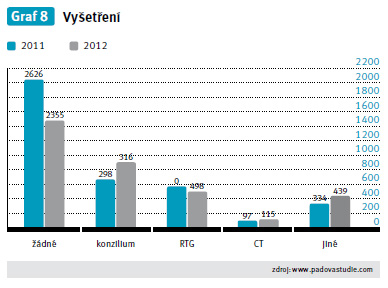 ■ Vyšetření - zdravotníci mohli zaznamenat „žádné", „konzilium", „RTG", „CT", „jiné". V obou sledovaných letech nebylo po pádu nutné „žádné vyšetření" (2048 - 62 %, respektive 1479 hlášení - 49 %).