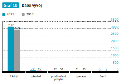 ■ Další vývoj - zdravotníci mohli zaznamenat „žádný", „překlad", „prodloužení pobytu", „operace", „úmrtí". V obou letech nedocházelo k „žádnému vývoji" (3122 hlášení - 94 %, respektive 2924 hlášení - 96 %).