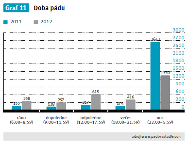■ Doba pádu - zdravotníci mohli zaznamenat „ráno (6,00-8,59)", „dopoledne (9,00-11,59)", „odpoledne (12,00-17,59)", „večer (18,00-21,59)", „noc (22,00-5,59)". V roce 2011 i 2012 byla nejčastější dobou pádu „noc" (2643 hlášení - 80 %, respektive 1350 hlášení - 45 %).