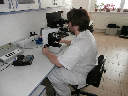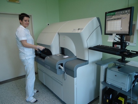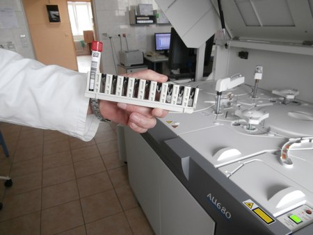 Pokud je identifikační štítek v pořádku a data se do systému načtou, vytiskne se ke každému vzorku čárový kód, kterým se zkumavky polepí, a vzorky se rozešlou buď na biochemii, nebo na hematologii. Obdobně je přijímán biologický materiál v dalších laboratořích. „Zkumavky vložíme do analyzátoru, který si ze štítku načte informace o pacientech a prostřednictvím laboratorního informačního systému i požadované metody, vzorky zanalyzuje a výsledky pošle zpět do systému," popisuje vedoucí úseku klinické biochemie Ing. Svatopluk Novák. Výsledky pacienta laborantka v PC zkontroluje a potvrdí, poté projdou ještě automatickou kontrolou podle předem nastavených kritérií. „Pokud nejsou tato kritéria dodržená, výsledky se zadrží a musí je zkontrolovat a potvrdit pověřený lékař ÚKBH společně pro borskou i lochotínskou část naší laboratoře," vysvětluje Ing. Novák.