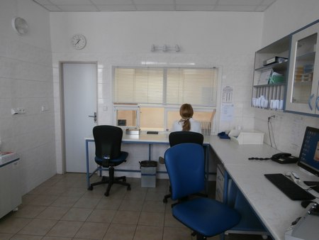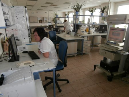 V první a největší jsou rozmístěny analyzátory, počítače a další přístroje, v prostřední místnosti je přijímán biologický materiál a třetí místnost patří hematologii. U příjmu vzorků jsou příchozí odděleni od laborantů prosklenou přepážkou s okénkem, kterým materiál podávají.