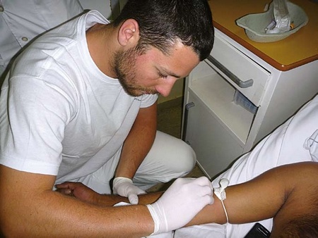 Ujaly se nás dvě mladé sestry, které jako jediné uměly trochu anglicky. Provázely nás celé dva týdny. Připadalo nám, že mají z pacientů trochu strach. Řekové jsou hodně citliví, takže se běžně stává, že i při měření teploty se rozpláčou i dospělí muži. Umíte si asi představit, co se dělo při odebírání krve... K tomu jsme se dostali až druhý den praxe. Přitom jsme se přesvědčili, co všechno už umíme. K odběru krve se v této nemocnici používaly klasické „desítkové" stříkačky se zelenou jehlou balené v Lukasteri-ku dohromady. Vacuette systém jsme sice zahlédli, ale bylo nám řečeno, že jej nepoužívají. Místo tampónů či čtverečků používají sestry k dezinfekci vatu namočenou v čistém alkoholu. Esmarchovo škrtidlo či turniket k odběru krve nepoužívají, končetinu zaškrcují gumovou rukavicí velikosti L. Jedno klasické šedivé gumové škrtidlo, které jsem s sebou měl, jsem oddělení věnoval jako dárek. Sestry se pak předháněly, která je bude používat dřív.