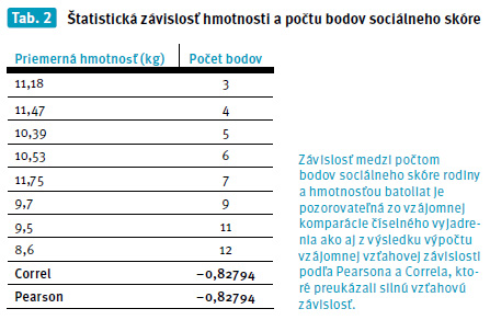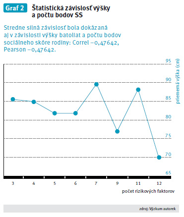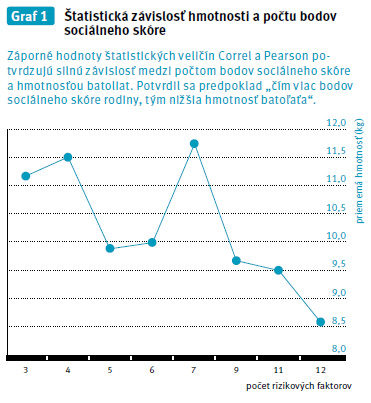 Z uvedených výsledkov nášho výskumu vyplýva, že vyšší počet bodov sociálneho skóre rodiny svedčiaci o prítomnosti rizikových faktorov značne ovplyvňuje psychomotorický vývin batoliat. Čím viac faktorov na dieťa posobí, tým viac klesá jeho priemerná hmotnosť i výška, zvyšuje sa ich počet zaradenia do skupín s priemerným, ale najma podpriemerným vývinom. Štatistickými výpočtami - Correl (-0,82794) a Pearson (-0,82794) - sme dokázali vysokú štatistickú významnosť závislosti posobenia sociálneho skóre rodiny na telesnú hmotnosť batoliat.