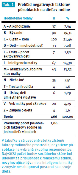 Vplyv sociálneho prostredia rodiny zásadnou mierou ovplyvňuje telesný aj psychomotorický vývin batoliat. Ak sú v prostredí rodiny prítomné rizikové faktory, rodina neplní svoju primárnu výchovnú funkciu. Pri hodnotení telesného a psychomotorického vývinu batoliat, v závislosti od posobenia rizikových faktorov rodinného prostredia, sme výsledkami výskumu zistili vysokú závislosť. Hmotnosť a výška batoliat ako aj psychomotorický vývin zaostávajú so zvyšujúcim sa počtom bodov sociálneho skóre rodiny. Čím vyšší počet bodov sociálneho skóre rodiny posobilo na batola, tým nižšia bola jeho hmotnosť a výška. Negatívny bol aj vplyv na psychomotorický vývin batoliat. Miera prítomnosti negatívnych faktorov bola hodnotená podla Dluholuckého. Najčastejšie posobiacim negatívnym faktorom posobiacim na respondentov bolo nevyhovujúce bývanie, nízka inteligencia matky v zmysle neschopnosti postarať sa o svoje dieťa a príslušnosť k rómskemu etniku.