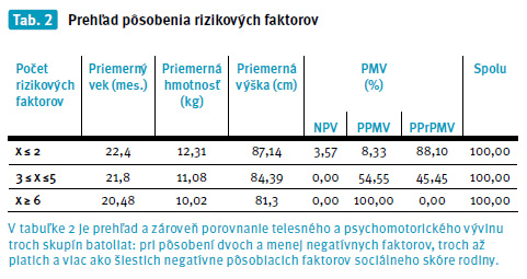 Vo výskume sme vzájomne komparovali telesný a psychomotorický vývin batoliat pri posobení 2 a menej rizikových faktorov (2 body), 3-5 faktorov (3-5 bodov) a viac ako 6 rizikových faktorov (6 a viac bodov).