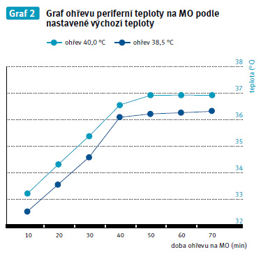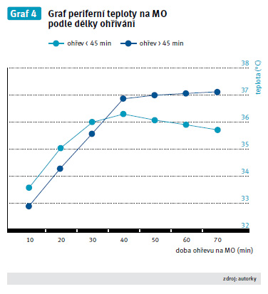 Pacienti, kteří byli ohříváni po dobu delší než 45 minut, opouštěli operační sál s průměrnou centrální hodnotou 37,1 °C. Teplota periferie na konci měření, tzn. po 120 minutách pobytu pacienta na oddělení pooperační péče, byla u odlišně ohřívaných pacientů rozdílná o 0,7 °C. Dosaženou teplotu je organismus schopen udržet a dále ji zvyšovat, ale než dosáhne optimální teploty, může dojít ke krvácivým komplikacím, které prodlužují pobyt na sále a zvyšují pravděpodobnost pooperačních komplikací v oblasti hojení ran.