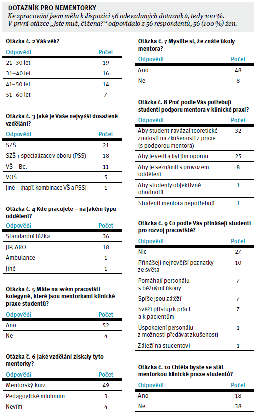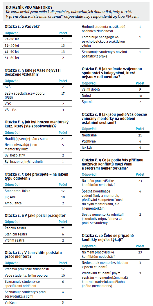 Dotazník pro sestry mentorky měl 15 otázek. První část dotazníku byla věnována identifikačním otázkám, v druhé části byly otázky týkající se role a činnosti mentora.