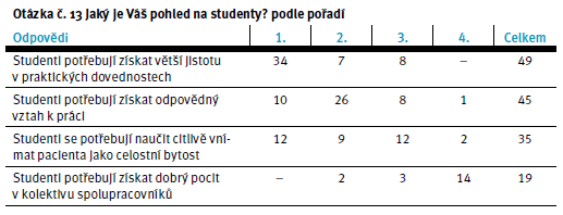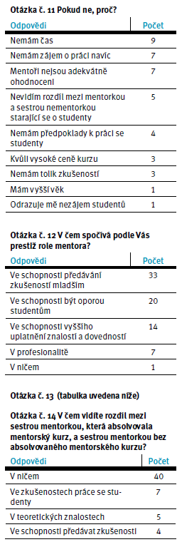 Na otázku „Myslíte si, že znáte úkoly mentora?“ odpovědělo pozitivně 48 dotazovaných (86 %) a negativně pouze 8 respondentek (14 %). Na otázku „Co podle vás přinášejí studenti pro rozvoj pracoviště?“ odpovědělo 27 dotazovaných, že studenti pro rozvoj pracoviště nepřinášejí nic, 10 dotazovaných si myslí, že přinášejí nejnovější poznatky ze světa, 7 dotazovaných si myslí, že pomáhají personálu s běžnými úkoly nebo že jsou spíše zátěží pro pracoviště, případně též že přinášejí svěží přístup k práci a pacientům. Další otázka se týkala zájmu sester o práci mentorky. Z celkového počtu 56 respondentek nemá zájem o práci mentorky 38 dotazovaných (68 %). Zájem stát se mentorkou klinické praxe studentů má 18 respondentů (32 %). Z celkového počtu 38 sester (68 %), které odpověděly negativně na předchozí otázku, uvádí 9 respondentek jako důvod nedostatek času, 7 jich uvádí, že o práci navíc nemají zájem, 7 respondentek nemá zájem stát se mentorkou studentů z důvodu neadekvátního ohodnocení mentorů. Celkem 5 respondentek nevidí rozdíl mezi mentorkou a sestrou nementorkou, 4 dotazované si myslí, že nemají předpoklady pro práci se studenty, a 3 respondentky zastávají názor, že cena kurzu je příliš vysoká nebo že nemají dostatek zkušeností. Jedna vidí problém ve svém vyšším věku a jednu respondentku odrazuje nezájem studentů.